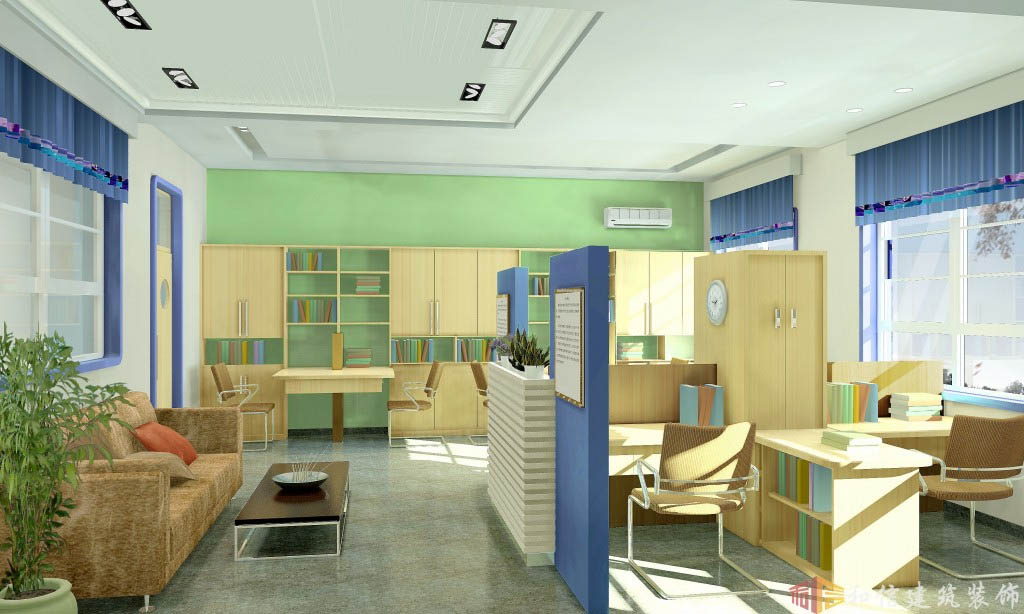 和信建筑以現(xiàn)代風(fēng)格為導(dǎo)向,利用合理的空間與分配,結(jié)合顏色、光、電鞥現(xiàn)代表現(xiàn)手法,為孩子創(chuàng)造出一個(gè)寬敞明亮 、溫馨舒適的學(xué)習(xí)環(huán)境。和信設(shè)計(jì)師團(tuán)隊(duì)采用充滿靈動(dòng)的色彩格子,運(yùn)用不拘一格的空間設(shè)計(jì),活躍了孩子的思維,對(duì)于培養(yǎng)孩子開(kāi)朗的性格有極大的幫助。本次設(shè)計(jì)成功之后獲得了學(xué)校領(lǐng)導(dǎo)的一致好評(píng)。
