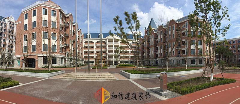 學(xué)校裝修外觀為古典城堡建筑風(fēng)格,錯落有致,色調(diào)搭配和諧、穩(wěn)重的同時冷暖色系比例合適,給人一種積極向上的觀感。室內(nèi)延續(xù)了建筑的色彩搭配,古典精致的吊燈安排在學(xué)生宿舍走廊,希望帶給學(xué)生一種溫暖的歸屬感。